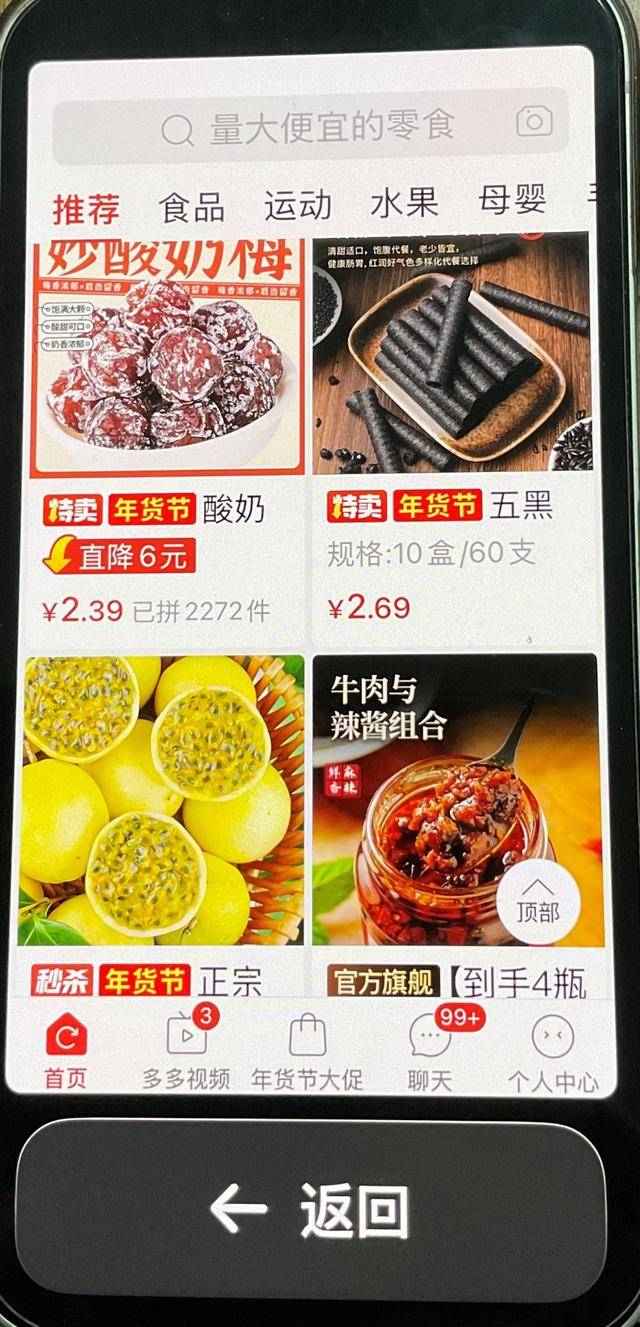 在拼多多平台,长辈模式的改变也基本仅体现在字体放大上,模式切换时宣称的“操作便捷”,记者体验时并没感觉到有什么变化。此外,许多老人的手机原本就有字体放大、界面放大的老年版功能,记者尝试用手机的老年版和三家平台的长辈版叠加使用,只有拼多多平台出现了明显的商品名称缺字现象,比如“咸甜妙酸奶梅”显示成了“酸奶”,“正宗黄金百香果”只显示出了“正宗”。