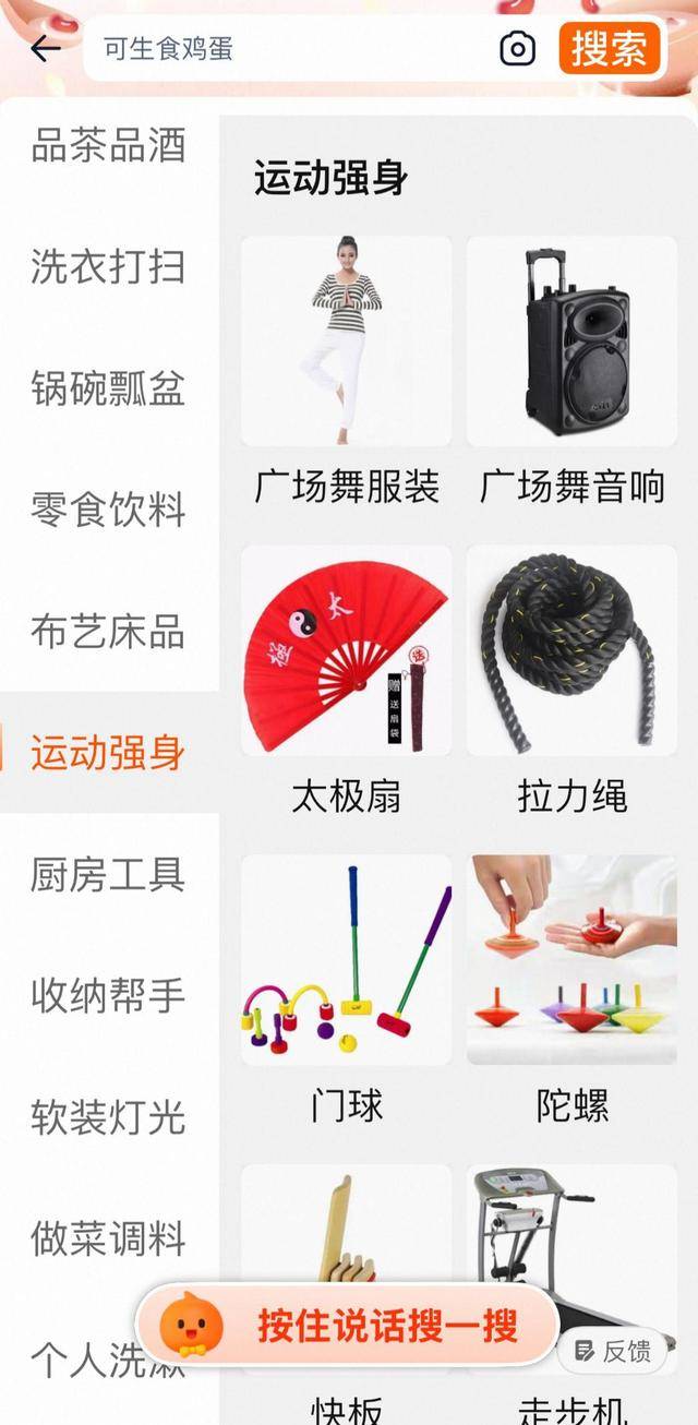 淘宝平台的长辈模式,是适老化设计相对较多的。除了基本的字体放大功能,在原本的普通模式下,用户只能输入关键字进行搜索,而在进入长辈模式,点击搜索栏之后,左侧会出现一个分类栏,包括了“生鲜买菜”“医药保健”“潮妈装”“酷爸装”等分类,基本涵盖了老年人生活各种场景。每一个大类里细分出的商品类型,也迎合老年人需求作出了专门的细分,比如运动强身一栏里,就有“广场舞服装”“广场舞音响”“扭腰盘”“筋膜球”“象棋”等常见的老年运动用品。