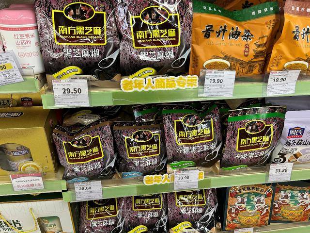 作为朝阳区首家政企合作老年友好型超市,京客隆超市华安店对店内环境进行过全面的适老化改造,而设立老年人商品专架就是其中的重点工作之一。二层靠北的这排专架,除了有一部分保健食品,其他大多是芝麻糊、豆奶粉、米糊等冲调食品。店员向记者介绍,专架上的商品是经过挑选的,比较符合老年人需求。