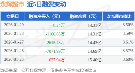 证券之星消息,1月29日,永辉超市(601933)融资买入6655.2万元,融资偿还6663.44万元,融资净卖出8.24万元,融资余额14.31亿元。