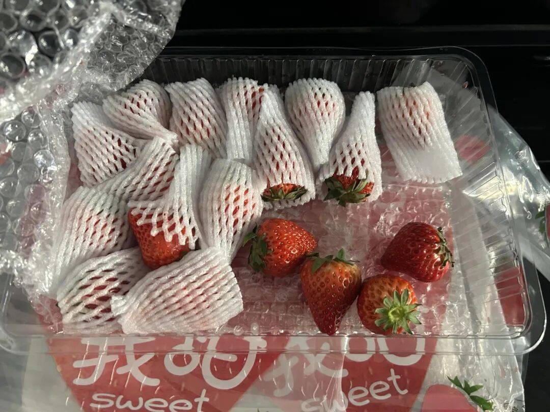 目前其草莓包装方案已从早期只用泡沫箱包装,升级到如今的四层包装方案,即珍珠棉包裹着包装箱,箱内还有一层珍珠棉包裹草莓盒,盒内每颗草莓外裹着泡沫网兜防震,面上还附有一张气泡带。虽然这增加了包材成本,但因其更好的保温效果,及防撞设计,使得草莓的货损能有效降低。吕福鹏算下来,总体成本并没有有明显增加。