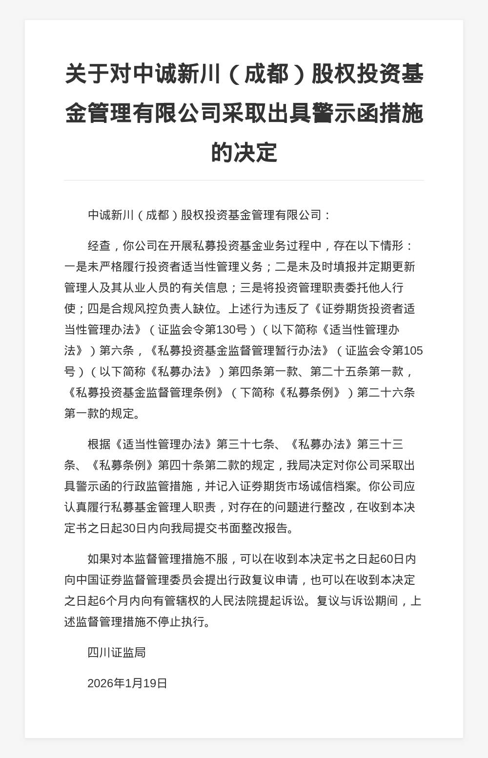 对此,四川证监局决定对中诚新川(成都)股权投资基金管理有限公司采取出具警示函的行政监管措施,并记入证券期货市场诚信档案。