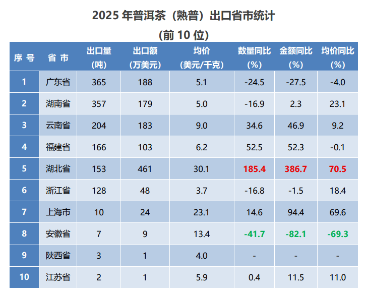 2025年普洱茶(熟普)出口持续下降,广东出口365吨,金额188万美元,居全国第一,同比分别下降24.5%和27.5%;湖北出口量(153吨)、金额(461万美元)、均价(30.1美元/千克)增幅最大达185.4%、386.7%和70.5%;安徽出口量(7吨)、出口额(9万美元)、均价(13.4美元/千克)降幅最大达41.7%、82.1%和69.3%。