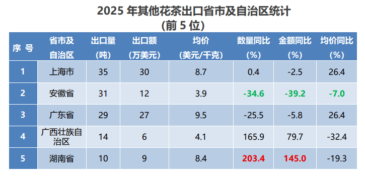 2025年其他花茶出口上涨明显,上海市出口35吨,同比上涨0.4%,金额30万美元,同比下降2.5%;湖南出口量(10吨)、出口额(9万美元)增幅最大达203.4%和145%;安徽出口量(31吨)、出口额(12万美元)降幅最大达34.6%和39.2%。