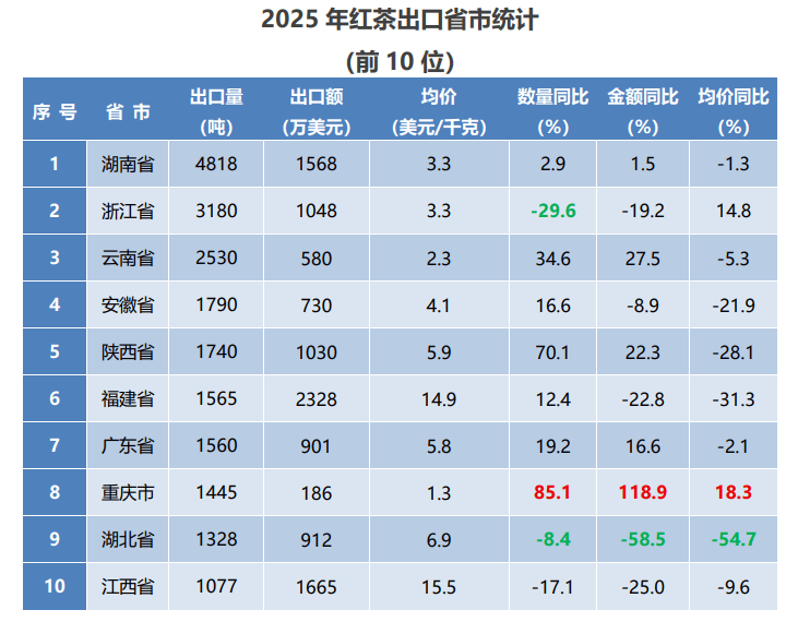 2025年共有十省市红茶出口突破千吨,湖南出口量(4818吨)居全国第一,比增2.9%;重庆出口量(1445吨)、金额(186万美元)、均价(1.3美元/千克)齐增,增幅最大达85.1%、118.9%和18.3%;湖北出口量(1328吨)、金额(912万美元)、均价(6.9美元/千克)分别下降8.4%、58.5%和54.7%;浙江出口量(3180吨)降幅最大达29.6%。