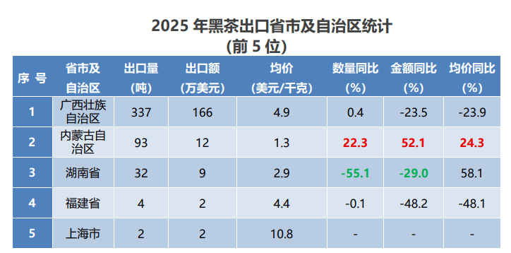 2025年黑茶出口量价额齐跌,广西出口量(337吨)和出口额(166万美元)占全国黑茶出口总量和总额的71.4%、83.8%;内蒙古出口亮眼,出口量(93吨)、出口额(12万美元)增幅最大达22.3%和52.1%;湖南出口量(32吨)、出口额(9万美元)降幅最大达55.1%和29%。