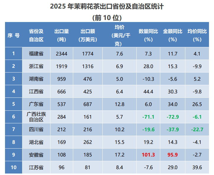 2025年多省份茉莉花茶出口向好,福建、广东出口量、金额、均价齐增,其中福建出口量(2344吨)和出口额(1774万美元)比增7.3%和11.7%,分别占我国茉莉花茶出口总量及总额的31.2%和30.6%;安徽出口量(108吨)、出口额(185万美元)增幅最大达101.3%和95.9%;广西、四川出口量、金额、均价齐跌,其中广西出口量(284吨)、出口额(161万美元)降幅最大达71.1%和72.9%,四川均价(10.2美元/千克)降幅最大达22.7%。