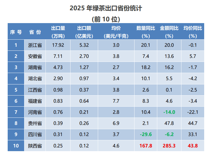 2025年共有七省份绿茶出口突破5000吨,浙江持续领先,出口量(17.9万吨)和出口额(5.3亿美元)分别占全国绿茶出口总量、总额的48.6%和42.8%(2024年占比为46.1%和41.3%);四川出口量(3126吨)降幅最大达29.6%;河南出口额(2134万美元)降幅最大达14%;陕西增幅亮眼,出口量(2529吨)、出口额(1154万美元)、均价(4.6美元/千克)同比分别增长167.8%、285.3%和43.8%。