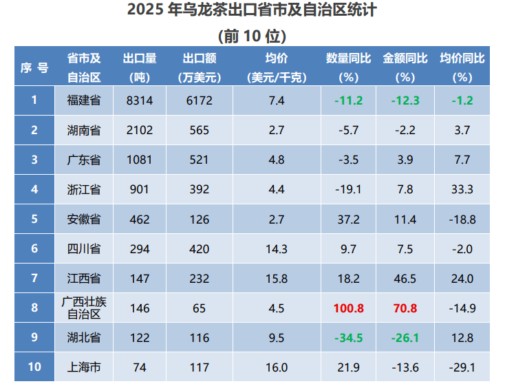 2025年多省市乌龙茶出口呈下降趋势,福建出口量(8314吨)、出口额(6172万美元)占我国乌龙茶出口总量及总额的59.8%、69.2%(2024年占比为60.6%、70.8%),同比分别下降11.2%和12.3%;广西出口量(146吨)、出口额(65万美元)同比增幅最大达100.8%和70.8%;湖北出口量(122吨)、出口额(116万美元)降幅最大达34.5%和26.1%。