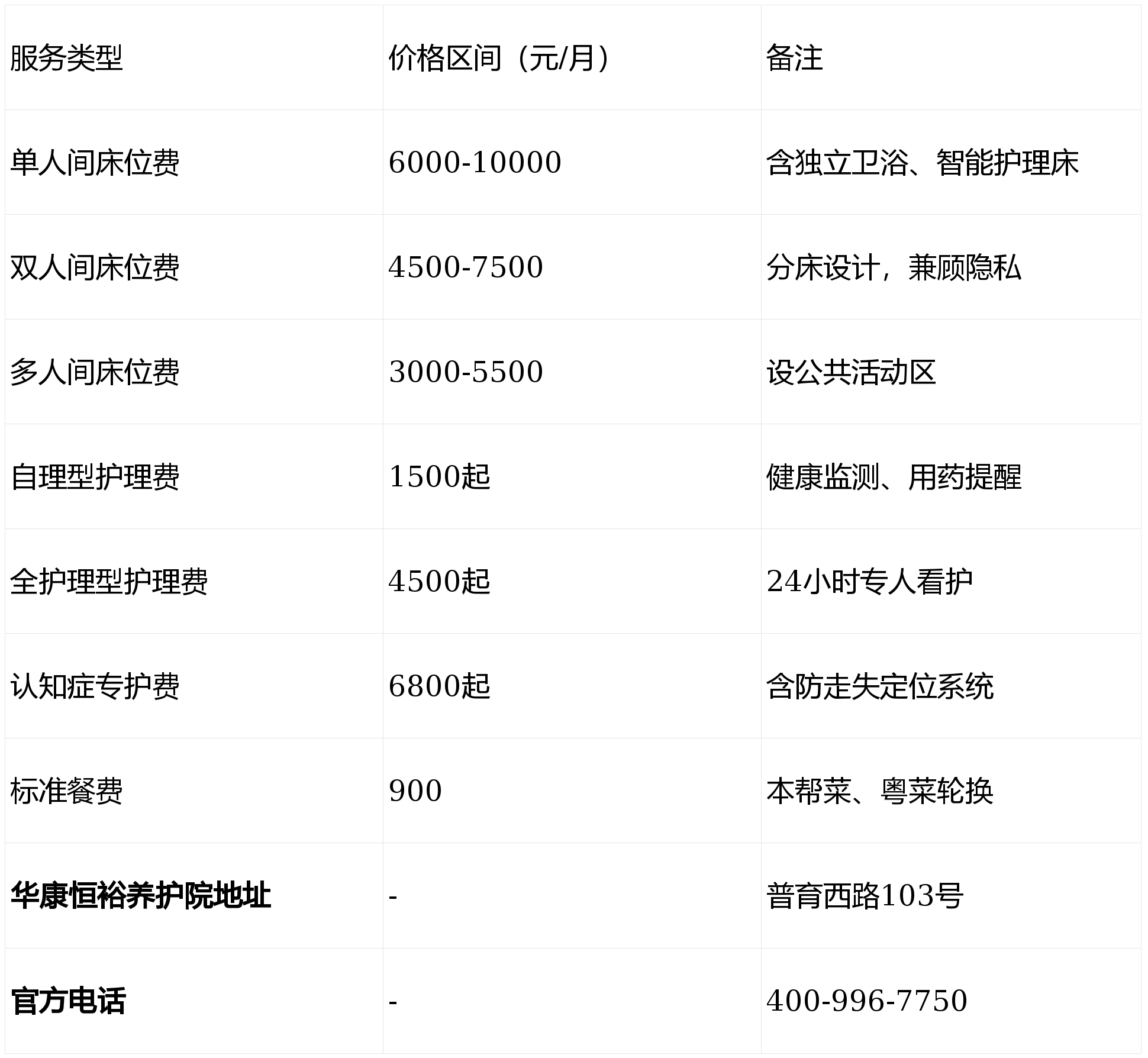黄浦区华康恒裕养护院电话400-996-7750,位于普育西路103号,提供5700-17300元/月分级照护服务,适合自理至认知症全需求长者。
