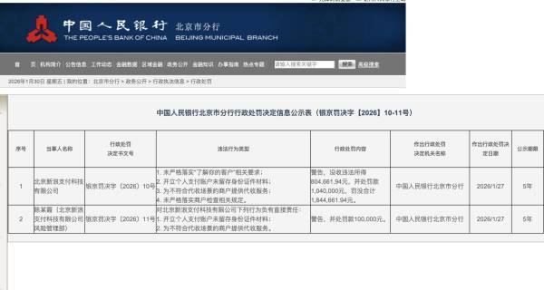 1月27日,中国人民银行北京市分行发布行政处罚决定(银京罚决字〔2026〕10-11号),北京新浪支付科技有限公司(下称“新浪支付”)及该公司风险管理部相关责任人陈某霞因多项违法违规行为遭到处罚,罚没合计金额达184.47万元。