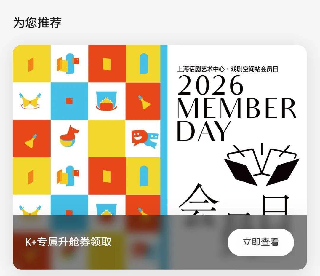 即日起,【升舱券】正式成为K+会员的会员权益之一。这是一张珍贵的权益凭证,持有者可在观看上海话剧艺术中心制作出品的指定剧目时,于演出当日现场,将手中的有效门票免费升至更高价位的观看区域。