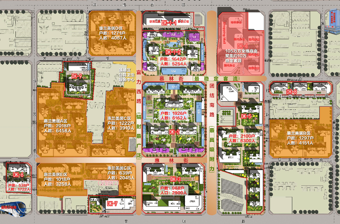 【地块四至】北邻DK1双子塔公寓,南邻DK2社区,西侧为莲湖区卫生服务中心及安置小区,覆盖2万+常住居民,东侧对望DK4商业Shopping Mall、写字楼集群,吸附商业中心、高端办公区约10万多层级消费人群,超强的中心虹吸原理,未来庞大人流赋能,钱景无限