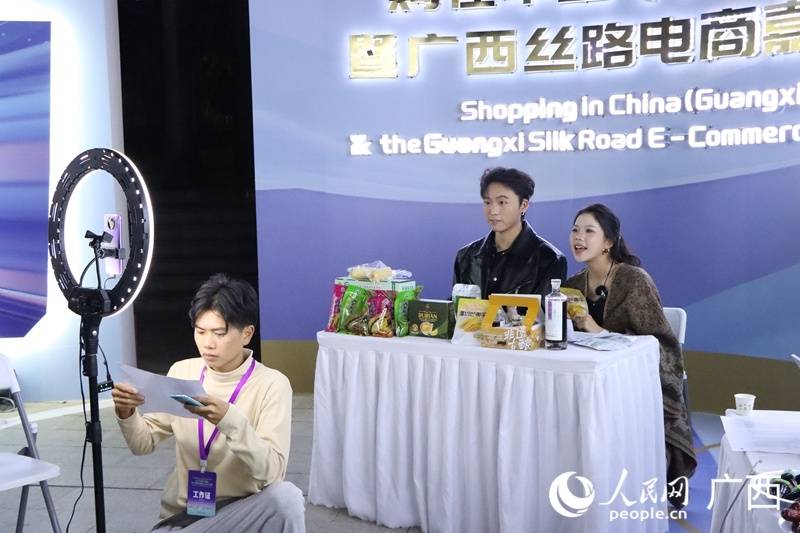 “购在中国(广西站)暨广西丝路电商嘉年华”活动现场,商家在直播带货。人民网 庞惠文摄