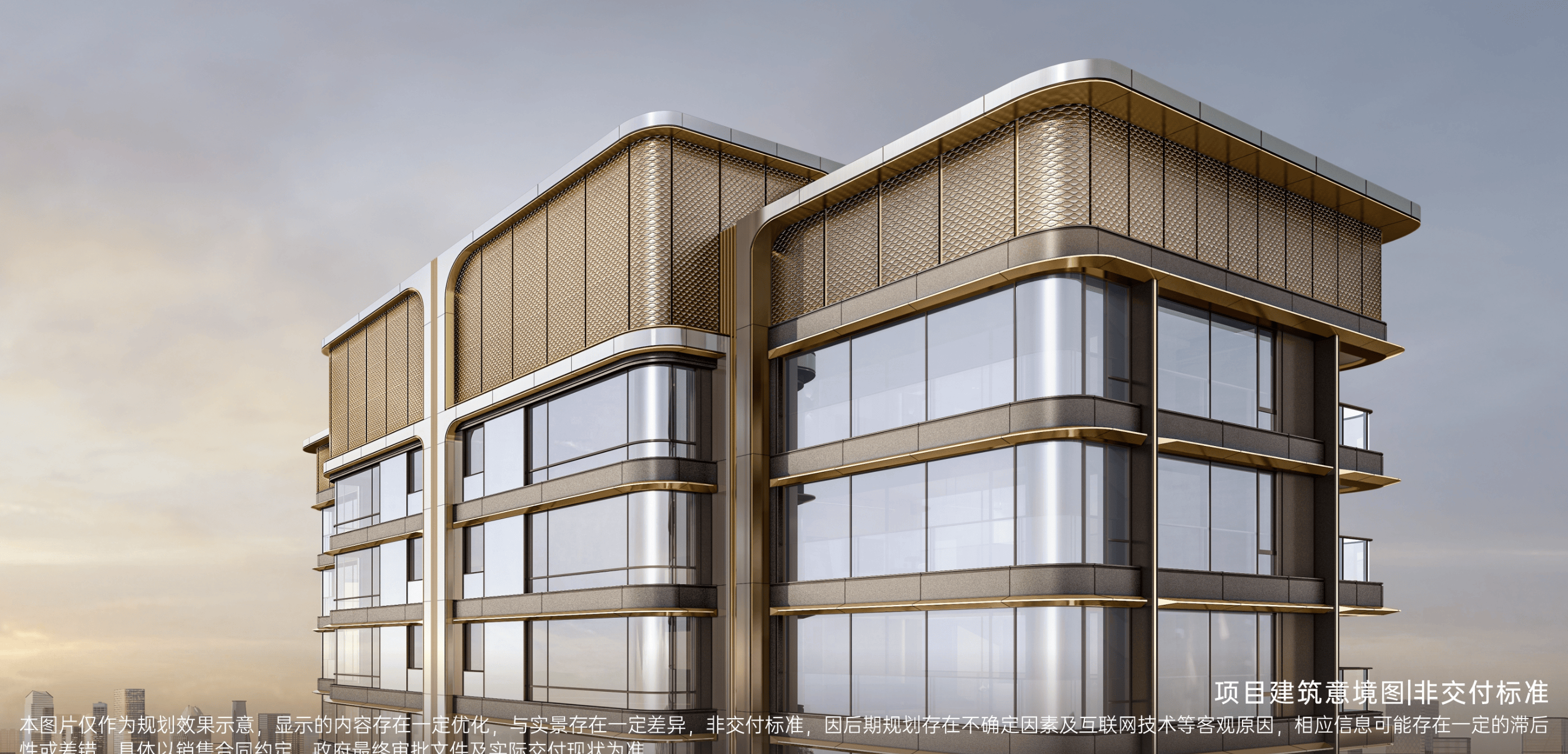 建筑通体以全弧线包裹,立面采用全景落地曲面玻窗,客餐厅与主卧实现270°环幕式观景面