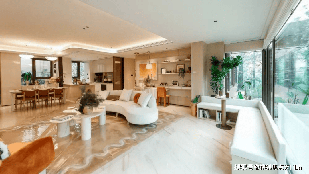 ①餐厅+客厅再配上约1.8 米深的等宽大阳台,有着近 50㎡的开阔区域;