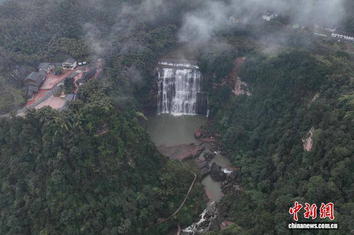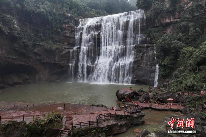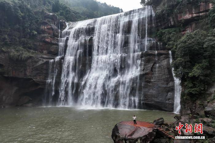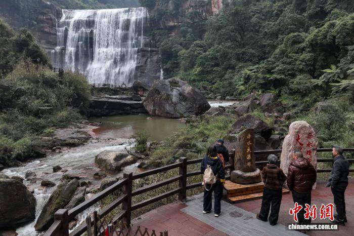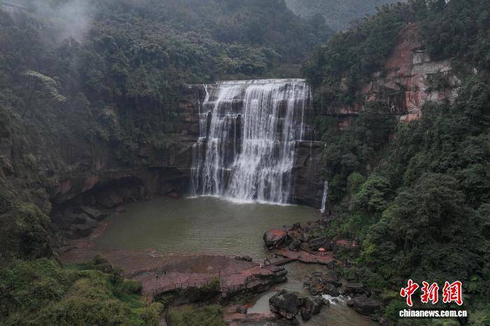 2月1日,位于贵州省赤水市两河口镇的赤水丹霞旅游区大瀑布吸引游客。大瀑布高76米,宽80米,是中国丹霞第一瀑、长江水系第一大瀑布,也是世界丹霞地貌上最大的瀑布。(无人机照片)中新社记者 瞿宏伦 摄