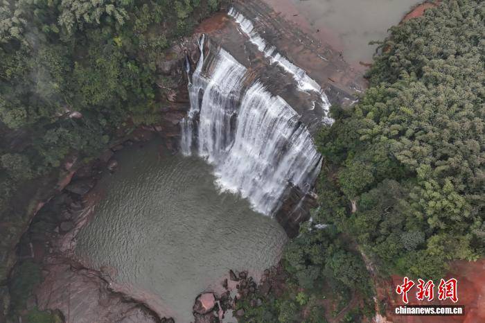 2月1日,航拍位于贵州省赤水市两河口镇的赤水丹霞旅游区大瀑布。大瀑布高76米,宽80米,是中国丹霞第一瀑、长江水系第一大瀑布,也是世界丹霞地貌上最大的瀑布。(无人机照片)中新社记者 瞿宏伦 摄