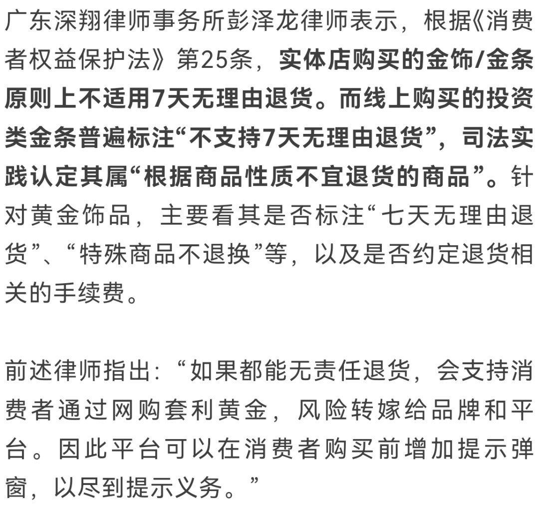 记者发现,有黄金品牌柜姐在社群中发布声明称:不能因为金价降了就要退货,不接受任何理由,退单一律扣500元。柜姐提醒称:“下单要为自己的行为负责,老板不会因为特殊情况特殊处理。”这一规定背后是否有法律支撑或行规约定俗成呢?