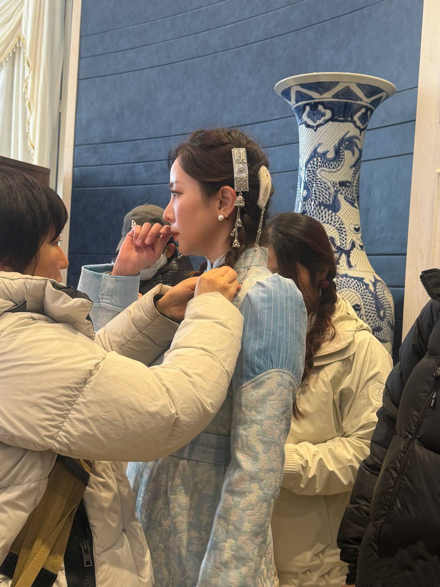 李思思的改良版旗袍,以浅蓝色为主色调,温婉灵动、显得她年轻了不少。