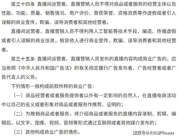 最后是对产品功效宣称的规范,这是对美妆直播营销最深刻的变革。《直播电商办法》第三十四、三十五条规定,将常见的直播口播、产品展示明确为“商业广告”,并禁止虚假功效宣传。