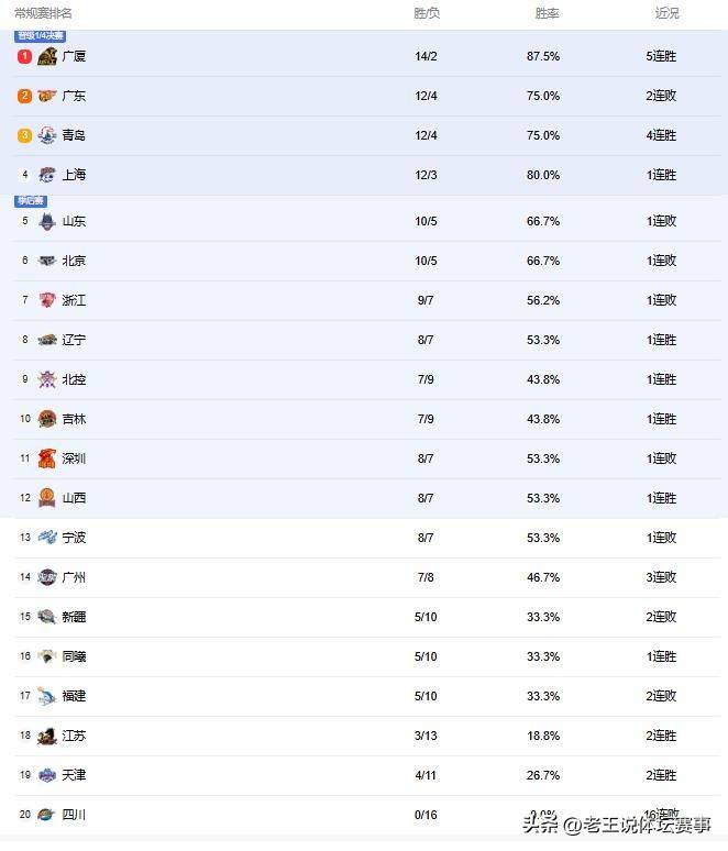 最后,让我们来看一下最新的积分榜:排名前八的球队依次是广厦、广东、青岛、上海、山东、北京、浙江和辽宁。