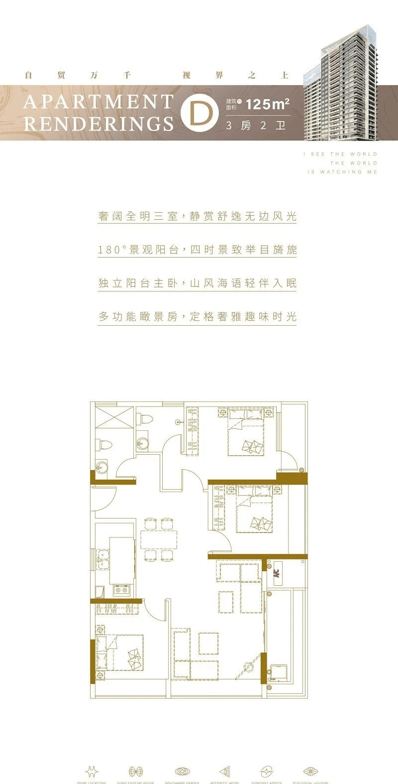 D户型:建筑面积约125㎡的三室两厅两卫。户型整体南北通透双阳台,入户玄关处精致的鞋柜收纳区间;功能分区明显且紧凑,空间利用率高;客餐厅一体化,与观景阳台相衔接 视野开阔,客餐厅位置即可欣赏到海景景观;正南向主卧,带独立卫生间,并配备生活阳台,生活舒适度大大提升。