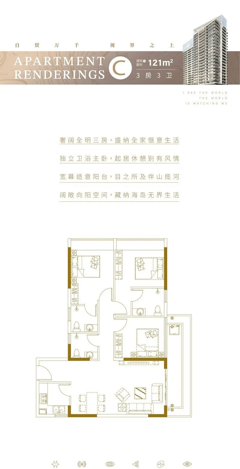 C户型:建筑面积约121㎡,三室两厅三卫。户型拥有拥有正南向的景观,南北通透,布局紧凑;厨房双灶台设计,生活便捷;客厅朝南外置约10米长的正南向阳台,还能欣赏到鹿回头公园景观;卧室均带落地窗,观景效果没的说;该户型做到了完美的动静分离布局,内侧餐客生活区,外侧卧室区,娱乐休息互不干扰。