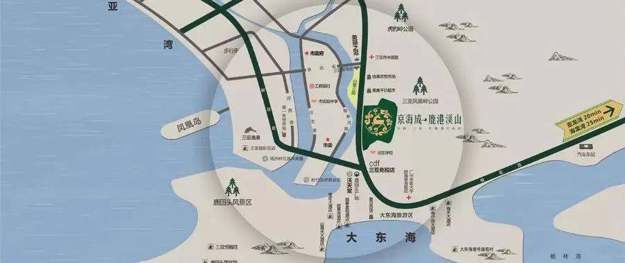 二十年,京海城酿一座鹿港溪山,北依凤凰岭,西靠白鹭湿地公园。毗邻大东海度假区,距离高铁站8公里、凤凰机场约15公里,距离轻轨站10公里,距海棠湾仅30公里,距亚龙湾20公里。绕城高速将海南省东、西线高速公路连接成海南环岛高速公路圈,与国道223、224、225及建设中的中线高速公路连成一体。