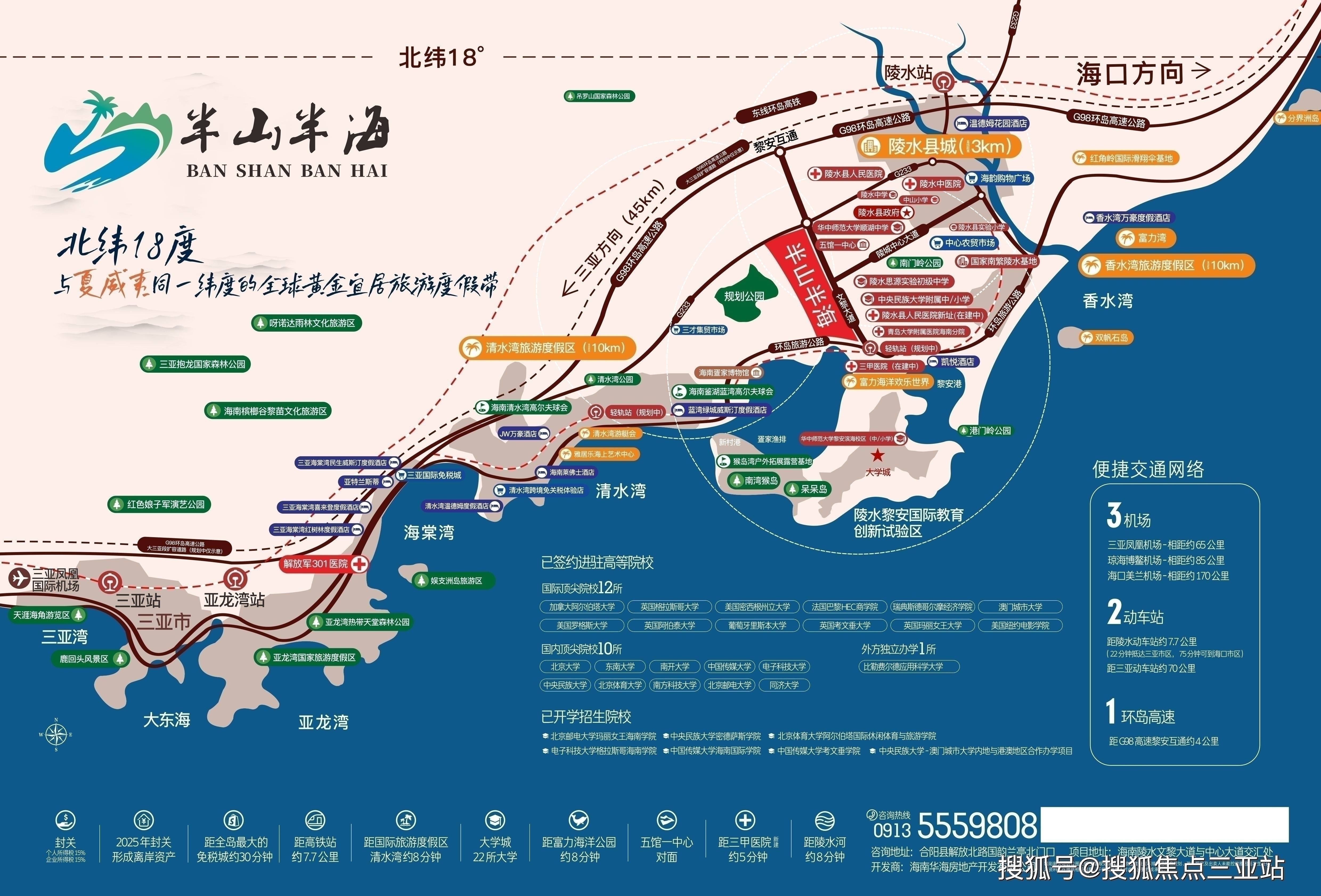 海南半山半海,大三亚经济圈,黄金海岸北纬18°,世界级康养度假天堂。项目位于北纬18°绝版黄金海岸,自贸港战略发展先导区——陵水黎安,拥有“三湾三岛两湖一山一水”的稀缺热带滨海资源和得天独厚的气候条件,坐拥于清水湾旅游度假区、陵水县城老城区和黎安国际教育创新试验区三区交汇的核心位置。项目总占地194亩,打造中央商务区和海南最大精品酒店集群,承载办公、商贸及度假生活需求,目前在售产品为80-120㎡安居、创客空间、45-125㎡沿街旺铺。