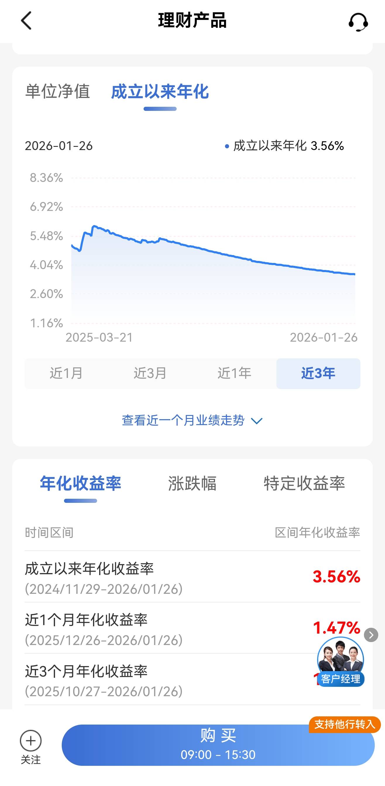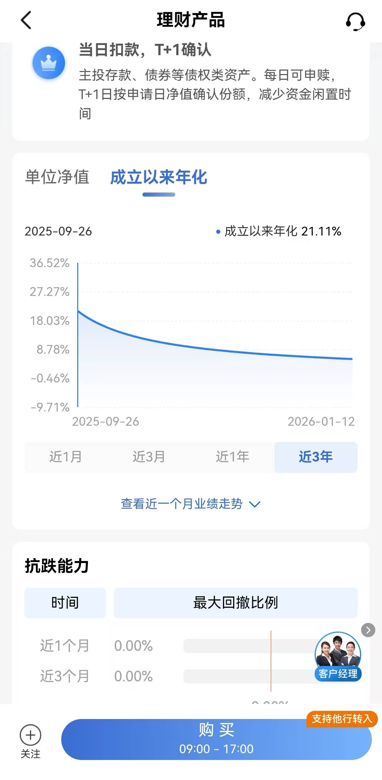 根据该理财产品公布的单位净值,1月19日净值1.022122元,1月25日净值为1.022381元,该产品七日年化收益率仅1.33%,如果继续查询10月中旬单位净值,该产品近3个月年化收益率仅为1.14%。