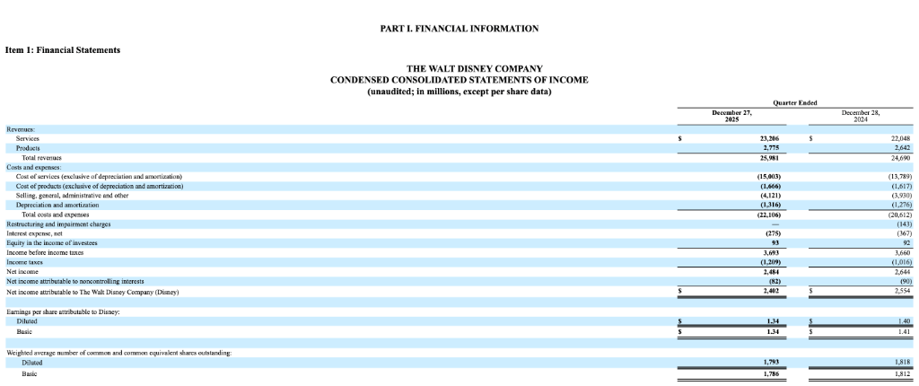 作为期后事项,ESPN于2026年1月与NFL达成资产交易,以出让10%非控股权益为代价,获得NFL Network等指定资产,该交易估值约30亿美元,并包含可在2034年后回购或增持股权的期权安排。该交易虽未直接体现于本季度损益,但将改变ESPN的股权结构(迪士尼有效持股比例降至约72%),进一步强化公司在体育内容与分发领域的布局。