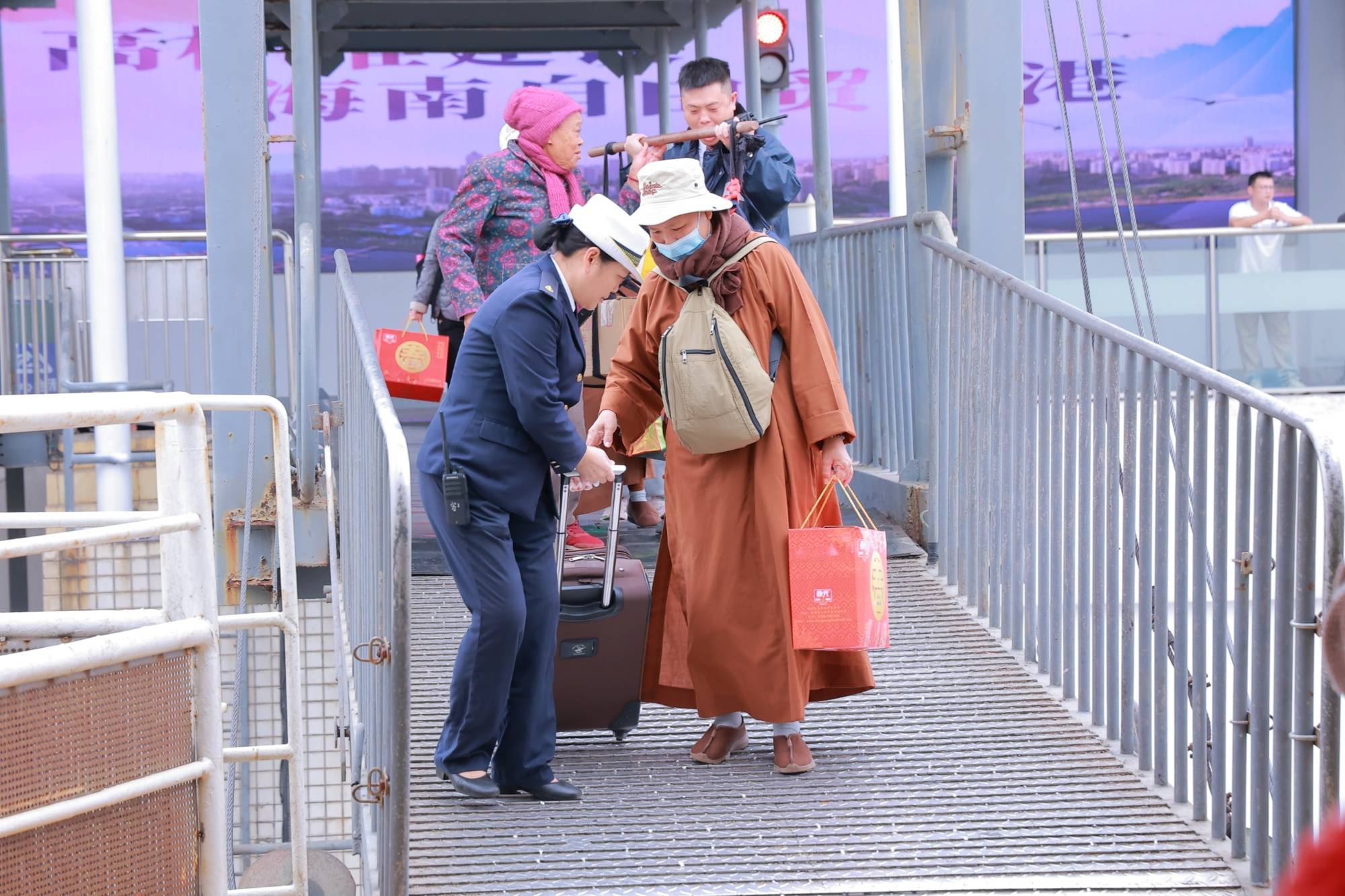 港口工作人员帮助旅客搬运行李(央广网发 李必政 摄)