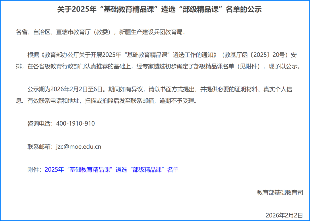 近日,教育部发布《关于2025年“基础教育精品课”遴选“部级精品课”名单的公示》,在各省级教育行政部门认真推荐的基础上,经专家遴选初步确定了“部级精品课”名单,并予以公示,公示期为2023年2月2日至6日。