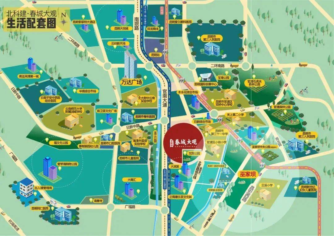 商业配套:项目往北达大悦城为核心的云纺商圈,达南屏街-顺城商圈,向西达昆明地标万达商圈及南亚商圈,向西南方向达红星爱琴海商圈及公园1903商圈;项目南侧就是大润发商业广场