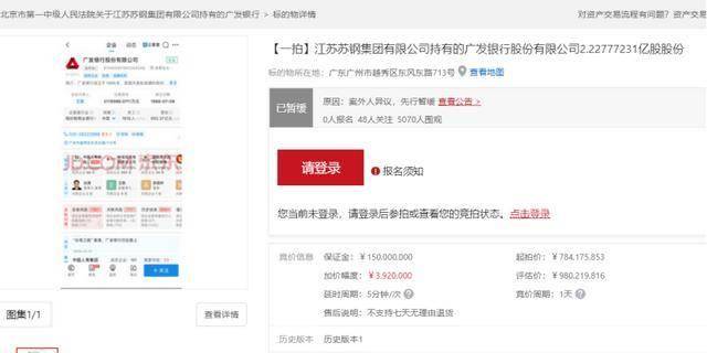 京东拍卖网上,江苏苏钢集团持有的广发银行2.2亿股股权,原定于1月27日进行司法拍卖。