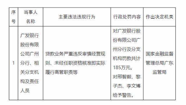 1月5日,广发银行新会支行因“违反审慎经营规则”被处以31万元罚款;次日,广发银行广州分行因贷款业务严重违反审慎经营规则、未经任职资格核准即实际履行高管职责等,被罚185万元。
