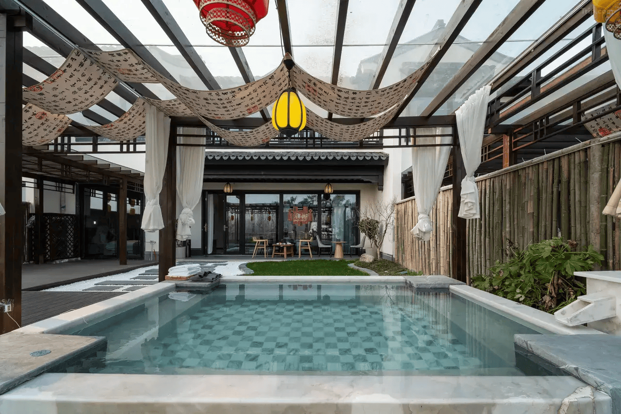 推荐理由:在北京昌平的山野秘境中,后院白虎涧民宿为多人欢聚提供了一处温泉私享天地。其“厂仓五居”房型内设三处独立私汤泡池,让每位宾客都能在客房专属区域,伴着暖身茶点享受无扰的温暖时光。泡汤后,还可漫步山野,感受白虎涧的自然景致。该房型凭借“私密性绝佳”“温泉入户”和“适合家庭团建”等亮点,在OTA平台获得4.7分“超棒”好评。