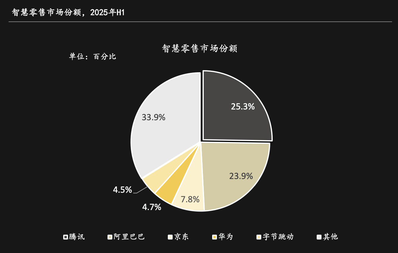 2月3日,国际咨询机构弗若斯特沙利文(Frost & Sullivan)发布《中国智慧零售市场追踪报告(2025H1)》。报告显示,2025年上半年,中国智慧零售整体市场规模已达107亿元人民币。其中,腾讯凭借25.3%的市场份额位居行业首位。
