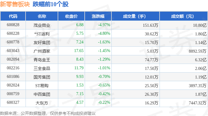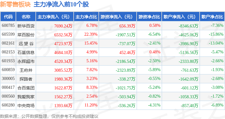 从资金流向上来看,当日新零售板块主力资金净流出3.35亿元,游资资金净流入1.02亿元,散户资金净流入2.33亿元。新零售板块个股资金流向见下表: