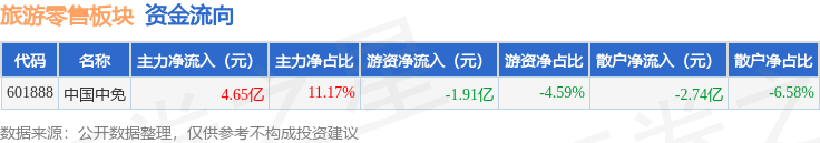 从资金流向上来看,当日旅游零售板块主力资金净流入4.65亿元,游资资金净流出1.91亿元,散户资金净流出2.74亿元。旅游零售板块个股资金流向见下表: