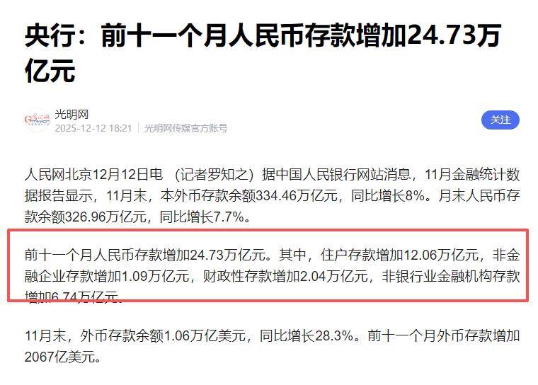 这临到年底,各行各业都开始进行年度总结,就连银行也不例外,最近官方报道了一则数据,2025年的前11个月,咱们的人民币存款暴增了24.73万亿,其中单老百姓作为用户存的款就高达12.06万亿,这个数据真是让人大开眼界,这么多钱被存到银行里,到底释放了什么信号?