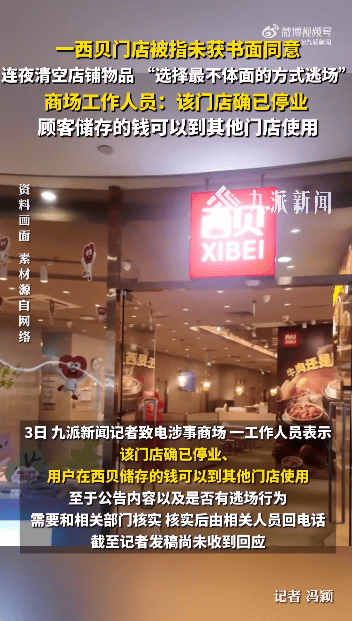 3日,九派新闻记者致电涉事商场,一工作人员表示,该门店确已停业,用户在西贝储存的钱可以到其他门店使用。至于公告内容以及是否有逃场行为需要和相关部门核实,核实后由相关人员回电话,截至记者发稿尚未收到回应。