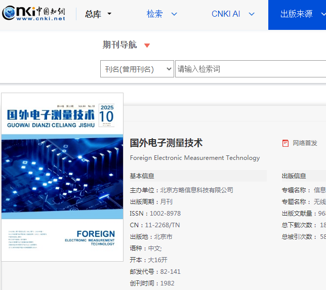 《国外电子测量技术》杂志创刊于1982年,由北京电子控股有限责任公司主管、北京方略信息科技有限公司主办的中国科技核心期刊。