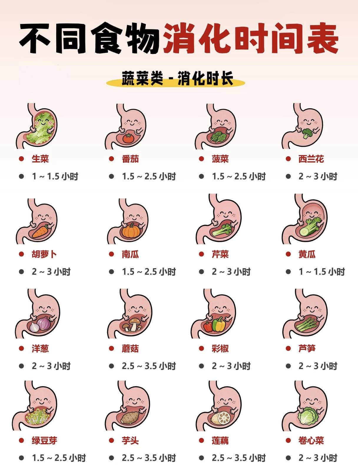 蔬菜是肚子里的“中长跑选手”。蔬菜通常需要45分钟到2小时才能消化完。像冬瓜、黄瓜这类水分足的瓜类蔬菜,跑得比较快;而像西兰花、菠菜这类叶子多或者纤维多的蔬菜,就跑得慢一些。特别是红薯、芋头这种根茎类的,消化时间更长,有时候都能赶上主食了。所以,如果宝宝消化能力还比较弱,像西兰花这种蔬菜,最好煮得软烂一点再吃。