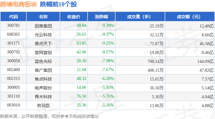 从资金流向上来看,当日跨境电商板块主力资金净流出62.75亿元,游资资金净流入12.9亿元,散户资金净流入49.85亿元。跨境电商板块个股资金流向见下表: