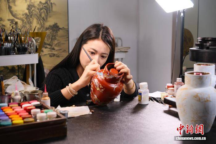 在她的工作室“听雨轩”里,“一举夺魁”“龙吟凤哕”“马年新春”等主题作品熠熠生辉,它们不仅是容器,更是凝结了选坛、灰坛打磨、上漆、图案打样、沥粉、油泥堆塑等十余道繁复工序的艺术品。