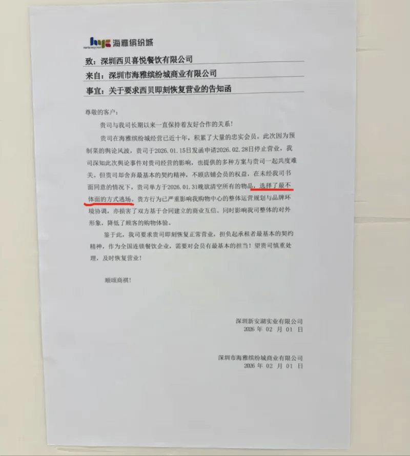 鉴于此,深圳海雅缤纷城要求西贝即刻恢复正常营业,担负起承租者最基本的契约精神,“作为全国连锁餐饮企业,需要对会员有最基本的担当!望贵司慎重处理,及时恢复营业!”