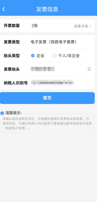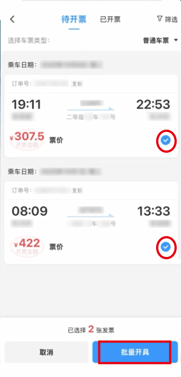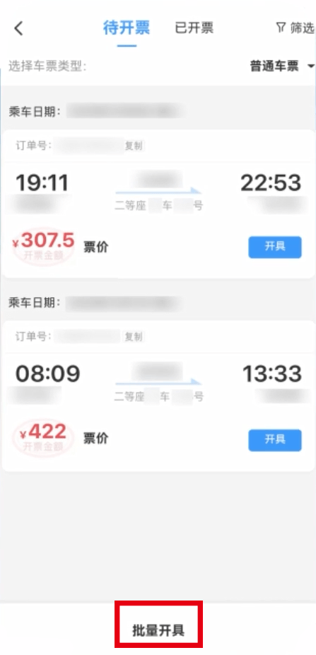 若有多个行程需要开具发票,选中相应行程后,点击“批量开具”,填写发票信息,确认提交后即可!