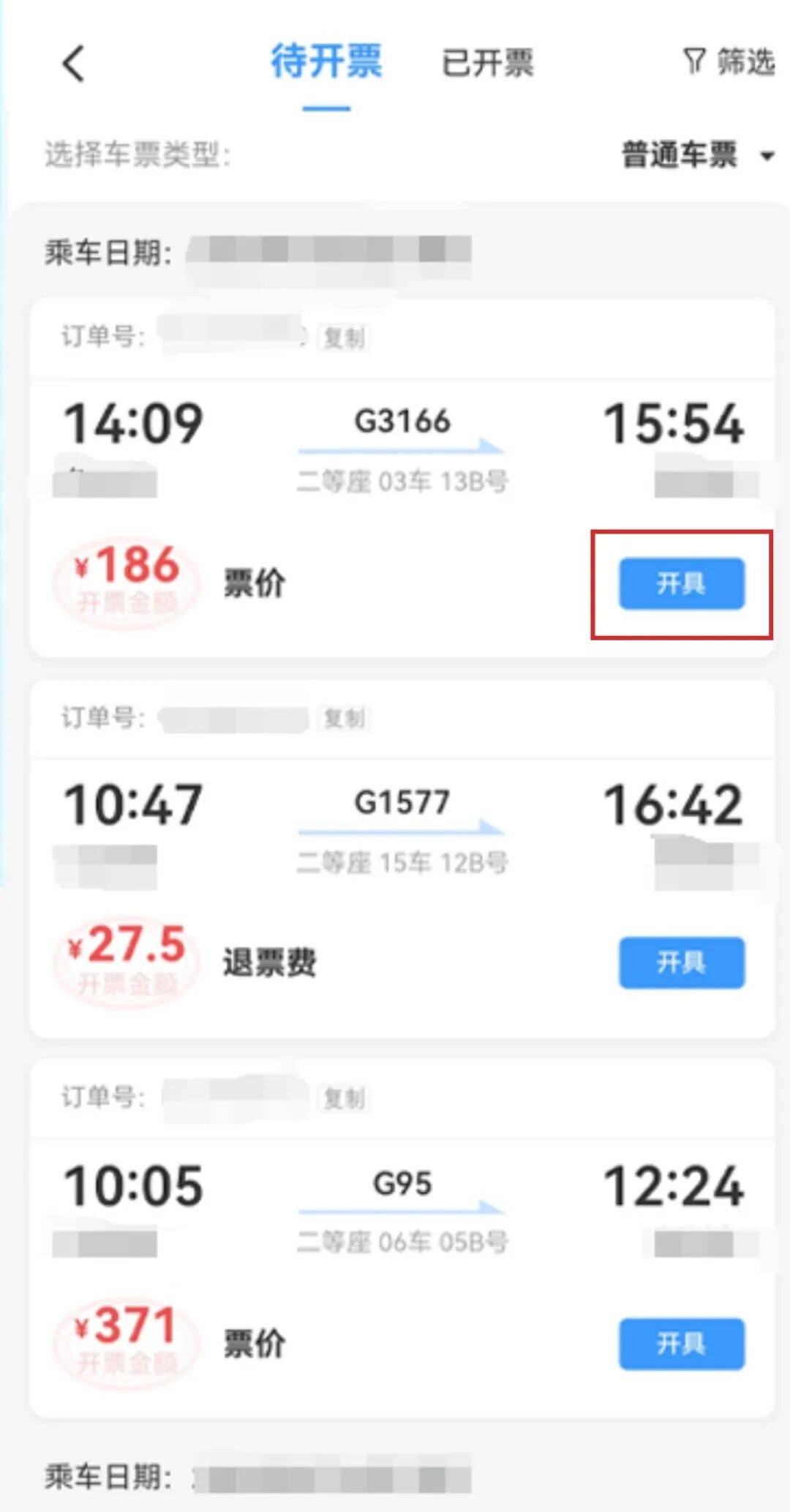 选择需要开具发票的行程,点击“开具”,填写发票信息,确认提交后开票成功。